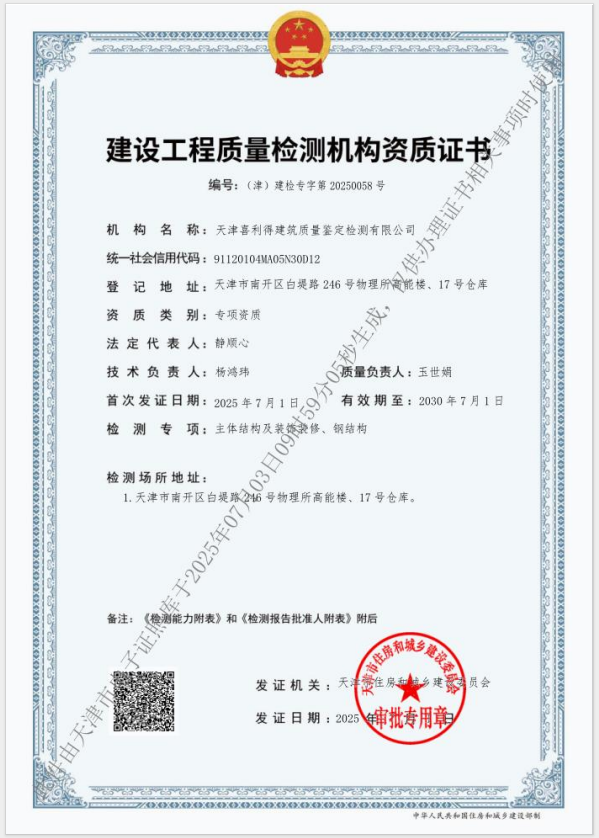 天津喜利得建筑質量鑒定檢測有限公司于2017年2月在天津市市場和質量監督管理委員會南開區市場和質量監督管理局注冊成立。于2018年8月18日取得天津市住房和城鄉建設委員會頒發的建設工程質量檢測機構資質證書。